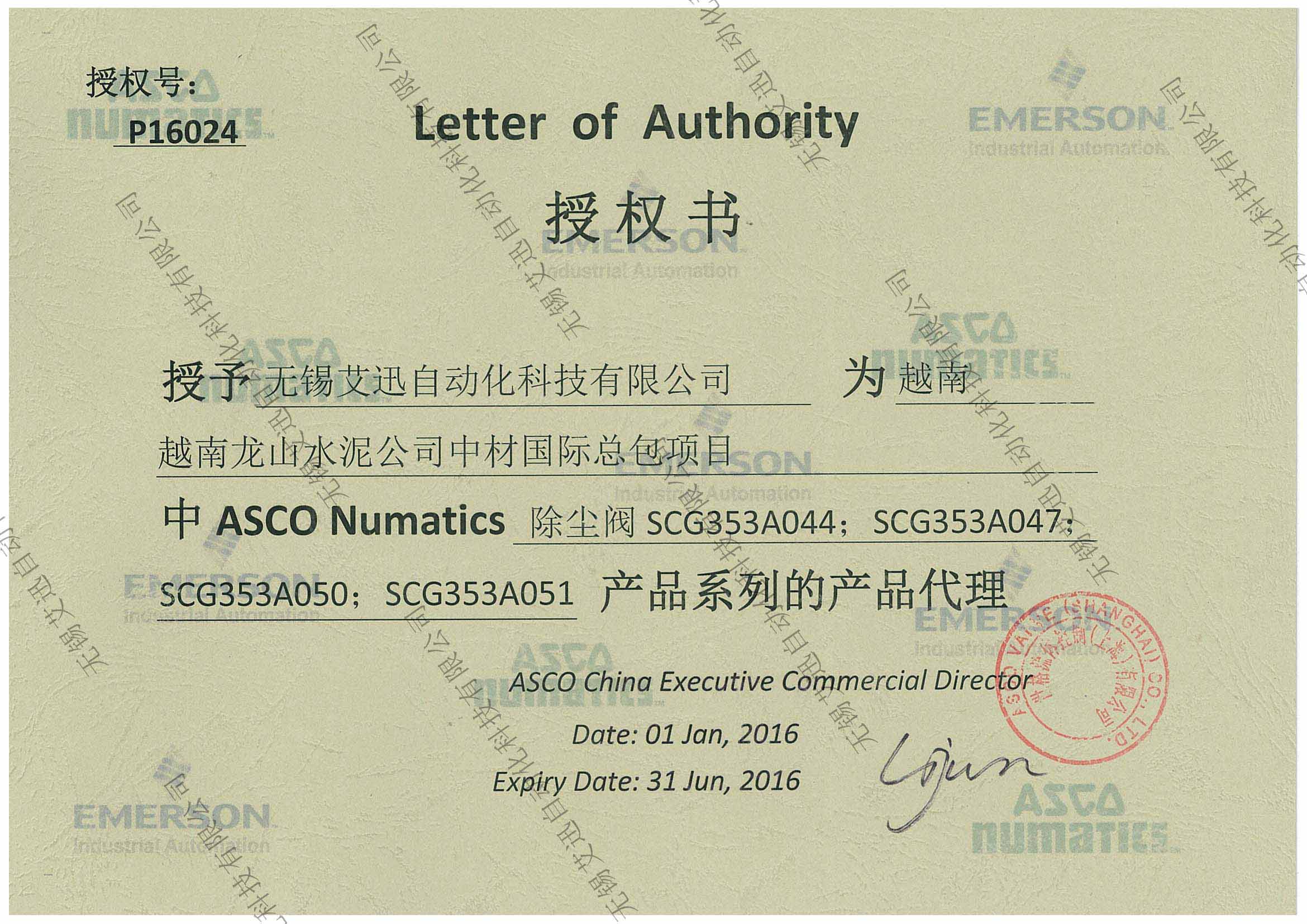 艾迅ASCO越南龙山水泥公司授权书